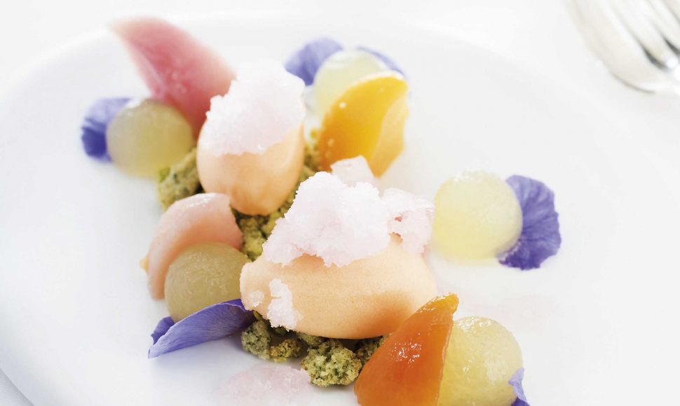 Un dessert frais et raffiné qui se déguste en été, des pêches pochées au basilic accompagnées d'un sorbet au melon et d'un crumble au basilic.