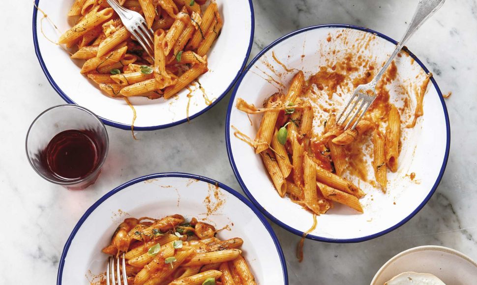Des penne accompagnées de tomates cerises et de mozzarella di buffala fumée et de piment peperoncino.