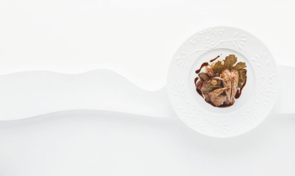 Perdreau de chasse rôti aux raisins, lardons, cèpes, châtaignes et morceaux de pain de campagne