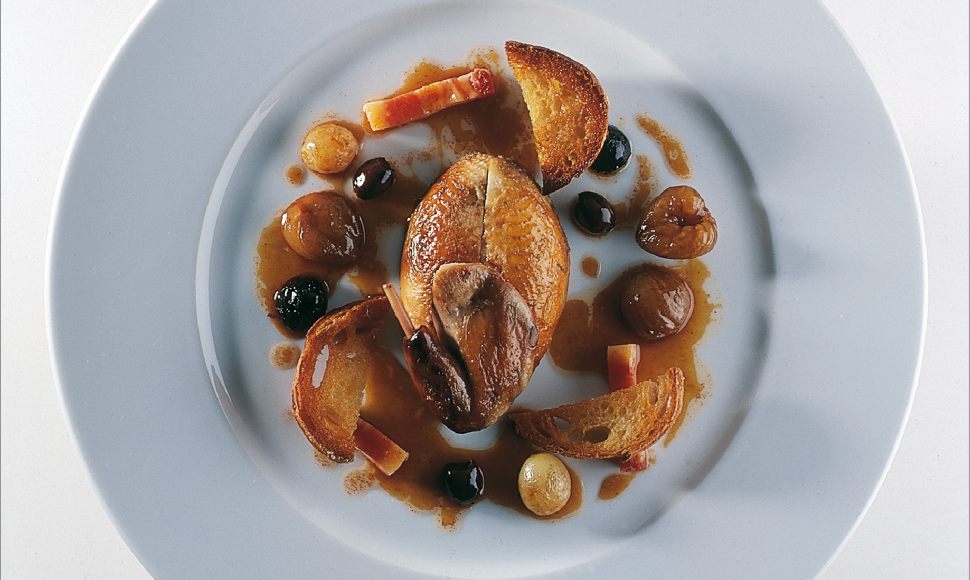 Perdreau de chasse rôti en cocotte noire, raisins, olives, châtaignes et bouts de pain mijotés ensemble
