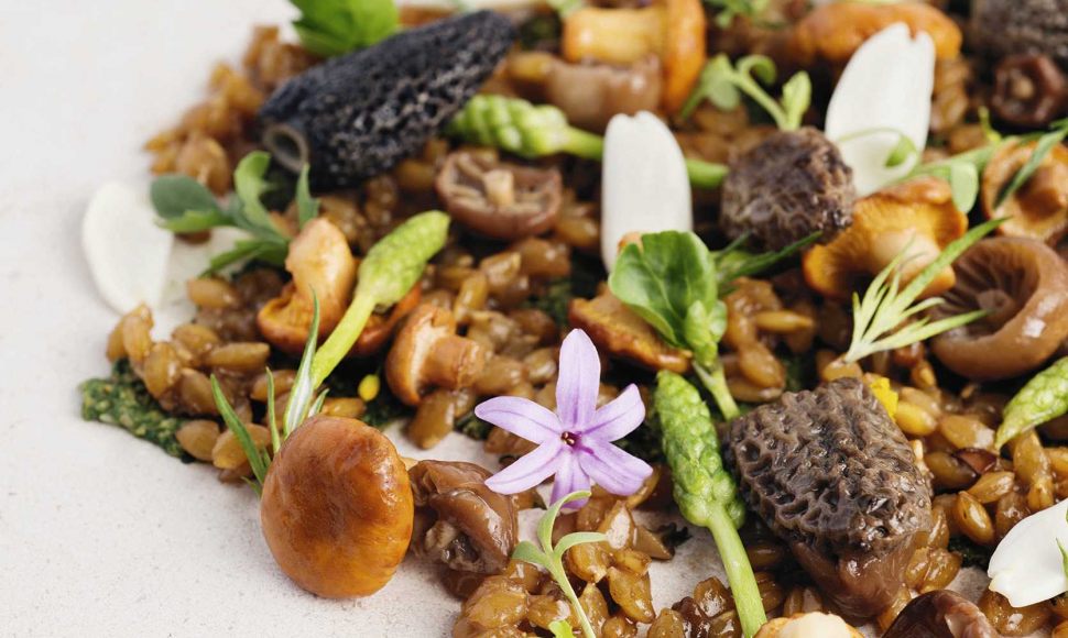 Un plat végétal évoquant l'esprit des sous-bois, au bord des champs de petit épeautre. Des champignons en tout genre liés à des asperges sauvages, pousses de cresson et des fleurs de raifort et de ciboulette !
