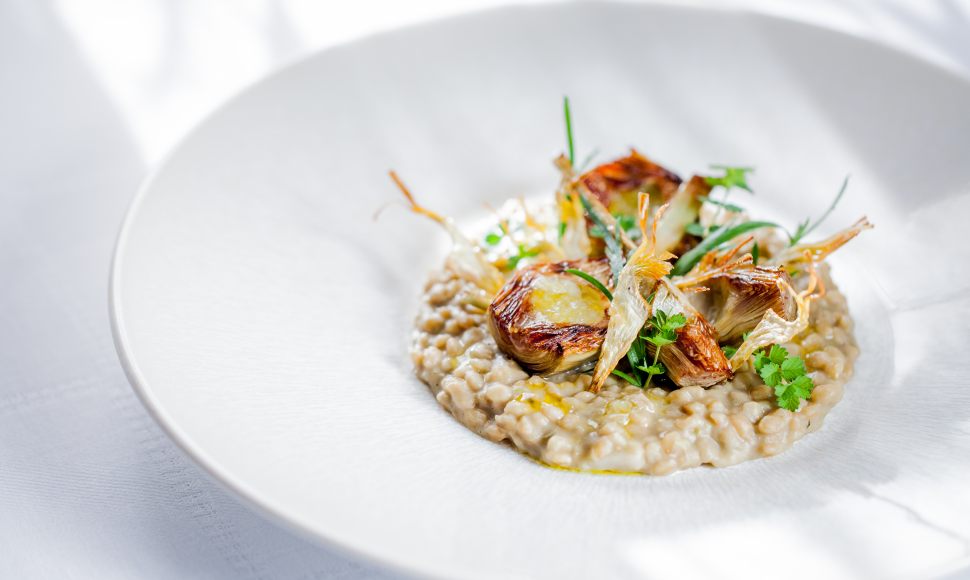 Peler et ciseler l'oignon. Tailler le lard en petits dés. Effeuiller et ciseler le romarin. Émincer les artichauts. Mettre le bouillon de légumes à chauffer. Dans une cocotte chauffée avec une goutte d’huile d’olive, faire fondre le lard puis ajouter l'oignon, le romarin ciselé et le poivre. Faire suer le tout sans coloration. Ajouter l’épeautre dans la cocotte. Le nacrer, c’est-à-dire le faire revenir lentement et sans coloration. Ajouter la brunoise de queues d’artichauts et les artichauts émincés. Verser le vin blanc et le laisser s’évaporer. Verser le bouillon chaud jusqu’à la hauteur de l’épeautre. Remuer avec une cuillère en bois, saler, laisser réduire de moitié à feu doux, c’est-à-dire faire évaporer le bouillon de façon à réduire son volume. Renouveler l’opération jusqu’à la cuisson souhaitée de l’épeautre. Retirer la cocotte du feu. Couper le beurre en petits dés et l’ajouter, bien mélanger. Verser 4 cuillerées à soupe d’huile d’olive et remuer. Puis ajouter le parmesan et remuer encore. Couvrir la cocotte et laisser reposer pendant 10 minutes.