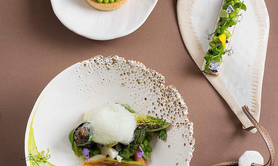 Petit pois, févettes, brousse de rove des garrigues, extraction des cosses, vinaigrette tiède de truffe, fine tarte au caviar osciètre clair