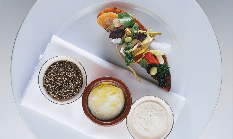 Petit pot de mamia poivre et sel une rôtie d’abattis de poularde de ferme, légumes primeur juste saisis