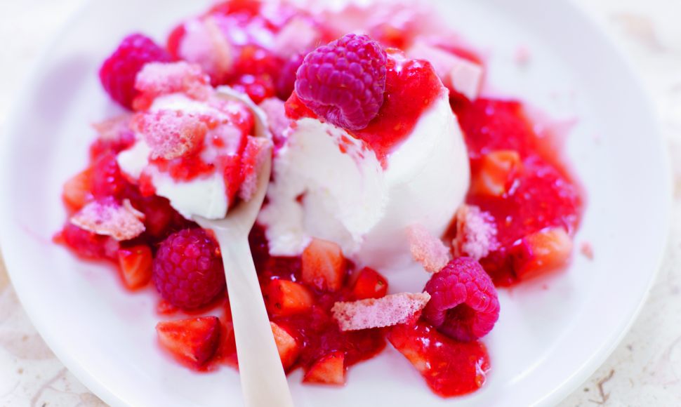 Alain Ducasse : "Pas de petit-suisse sous la main ? Prenez du fromage blanc ! Pas de biscuit rose ? Concassez finement des pistaches ou des amandes. Essayez aussi sans sirop d’agave, histoire de l’habituer à une certaine acidité."