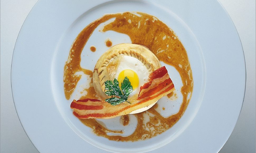 Petite tourte de pommes de terre et poireaux, œuf de caille et copeaux de lard croustillants