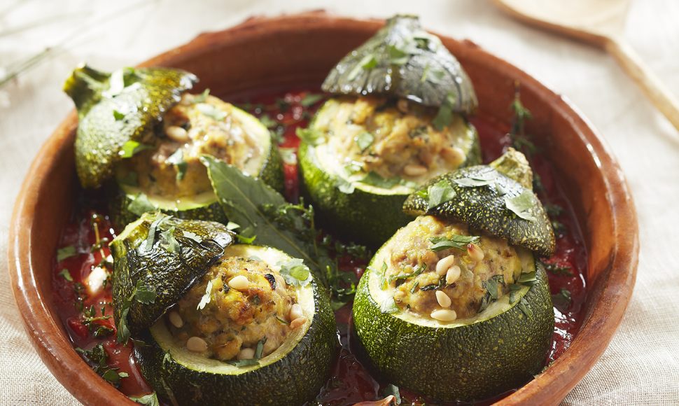 Préparer la farce, en coupant les chapeaux des courgettes et en les vidant de leur pulpe (conserver la pulpe). Ciseler finement l’oignon et l’ail. Hacher la pulpe de courgette. Cuire la pulpe, l’oignon, l’ail et l’huile d’olive pour obtenir une pâte. Refroidir. Torréfier les pignons. Hacher le basilic. Mélanger le tout avec le haché de veau, le piment doux, l’anis vert et le curcuma.