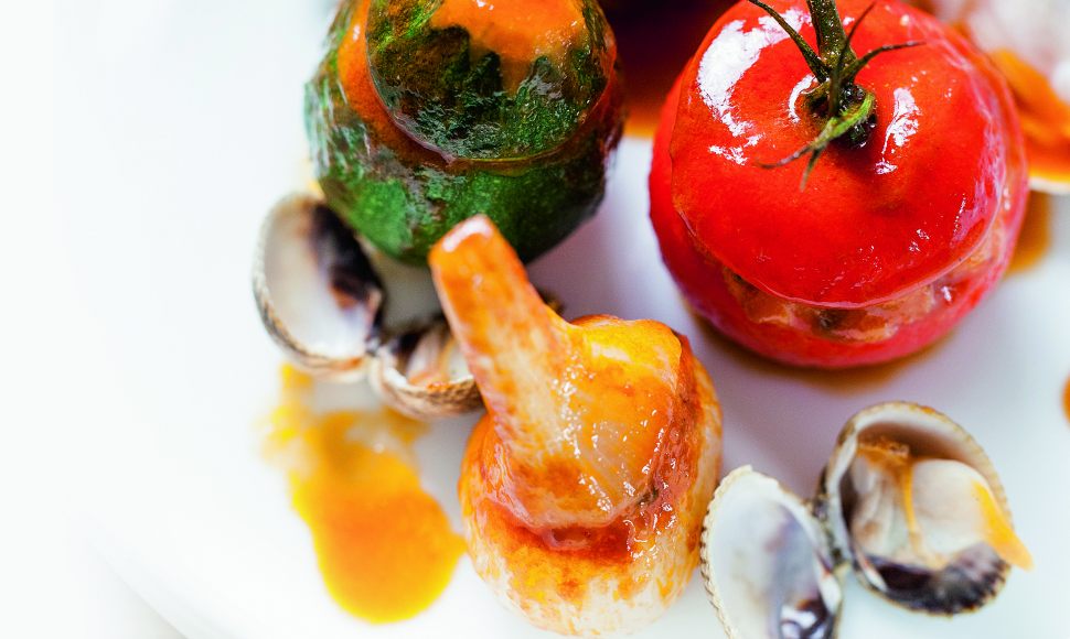 Lavez et creusez les tomates, les oignons, les courgettes et les aubergines. Salez les tomates et laissez-les dégorger à l’envers. Faites blanchir les oignons, les aubergines et les courgettes dans une eau frémissante salée, puis faites-les refroidir aussitôt. Une fois refroidis, mettez-les à égoutter sur un linge sec.