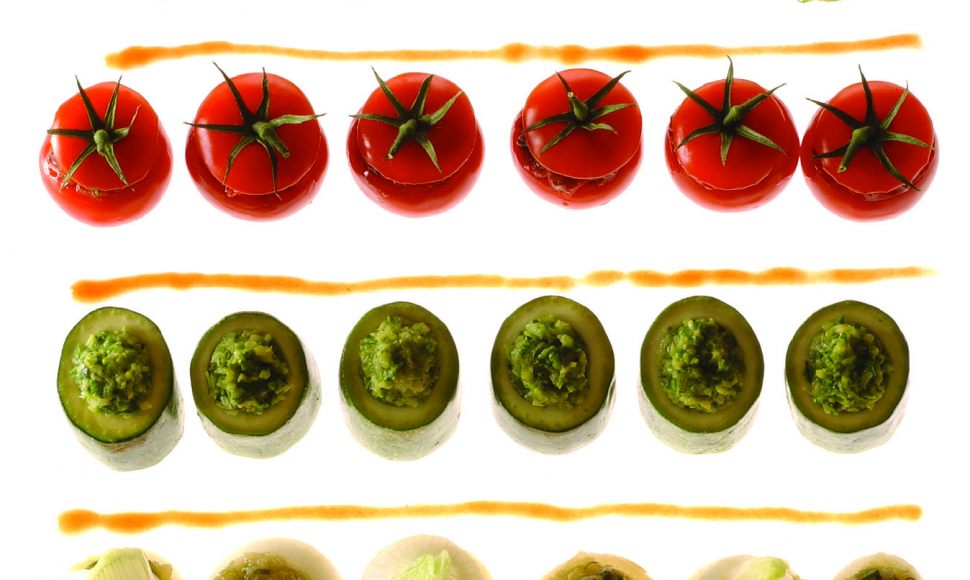 Monder les tomates délicatement en conservant le pédoncule. Couper les tomates à 5 mm du pédoncule pour leur faire un chapeau. Épépiner délicatement à l’aide d’une cuillère parisienne en laissant les cloisons internes. Assaisonner légèrement les tomates de fleur de sel, les retourner sur une grille en inox et les laisser dégorger pendant 15 minutes.