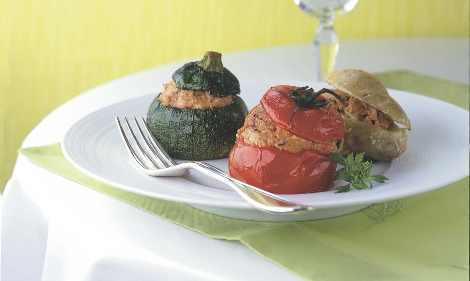 Des légumes (aubergines, courgettes, tomates, poivrons et pommes de terre) farcis à la viande.