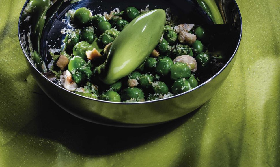 Le petit pois dans tous ses états: nature, en crème, en glace, en... papier ! La diversité des textures et des températures crée une grande variété de sensations gustatives.