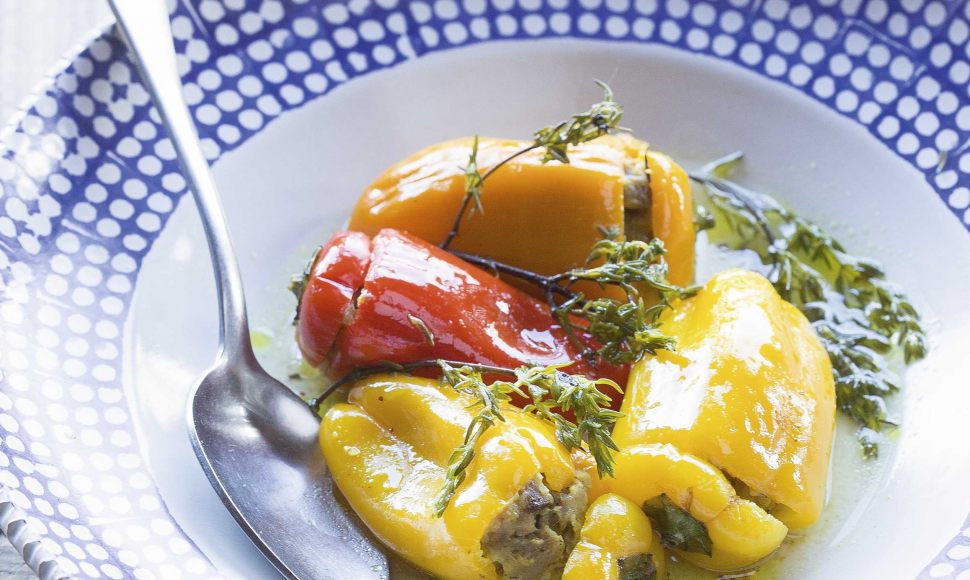 Un plat de poivrons farcis à la chair de saucisse, pain, lait, ail et herbes.