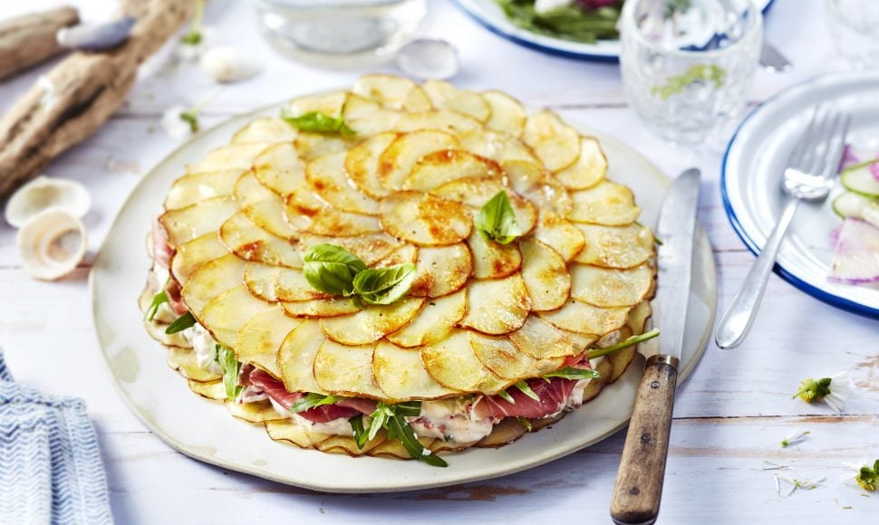 La pomme de terre primeur de Noirmoutier possède un petit goût sucré et une chair fondante. C'est une Indication Géographique Protégée. Avec de la roquette, du jambon cru, de la ricotta, cette recette d'inspiration italienne, en clin d'oeil à la pomme Anna, permet d'en faire un plat ou une entrée tout en équilibre.