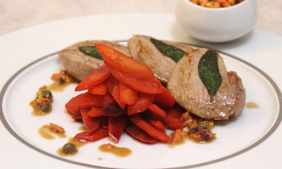 Le veau de lait, qui est une viande blanche particulièrement tendre, est délicatement parfumé à la sauge lors de sa cuisson. Accompagné de carottes violettes, jaunes et oranges vous dégusterez un plat complet, gourmand et faible en matières grasses.
