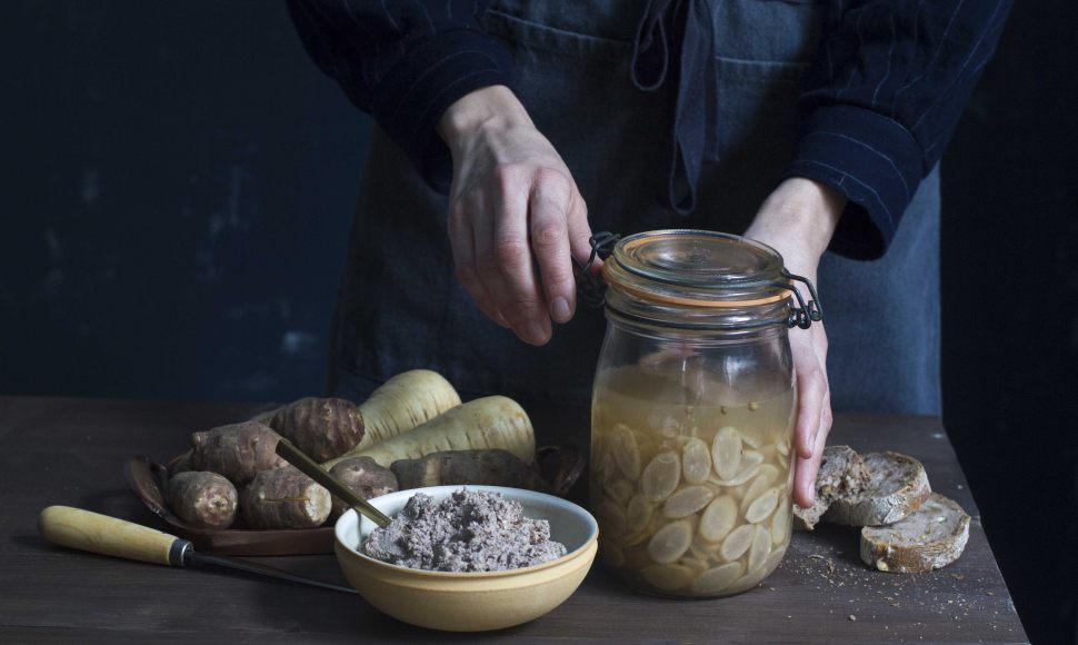 Une conserve de pickles de salsifis au vinaigre blanc, à picorer ou à incorporez dans vos recettes selon vos envies (pour 1 bocal de 1 l).