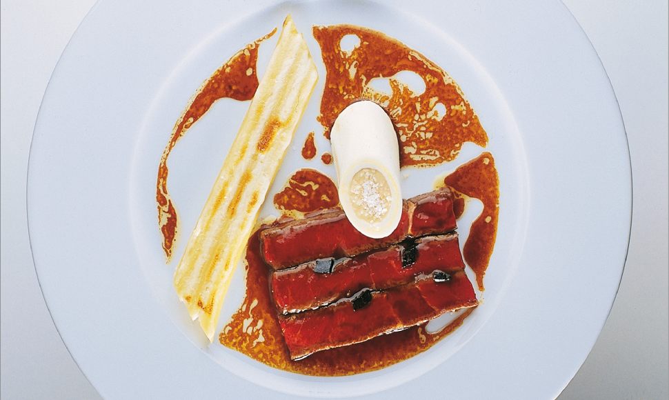 Pièce de bœuf de chalosse épaisse piquée de truffes noires et d’olives à la façon de lucien tendret, cuite en cocotte, vrai jus, os à moelle, gratin de macaroni