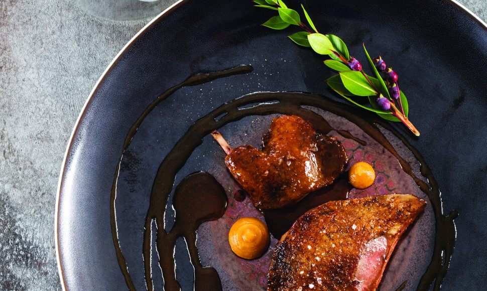 Pigeon au sang en croûte de sel épicée servi rosé, pâtes d'avoine, jus acidulé au vinaigre de myrte sauvage