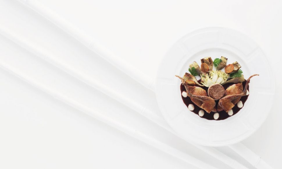 Pigeon de Racan entier en cocotte, artichauts sautés/crus, crème de topinambour