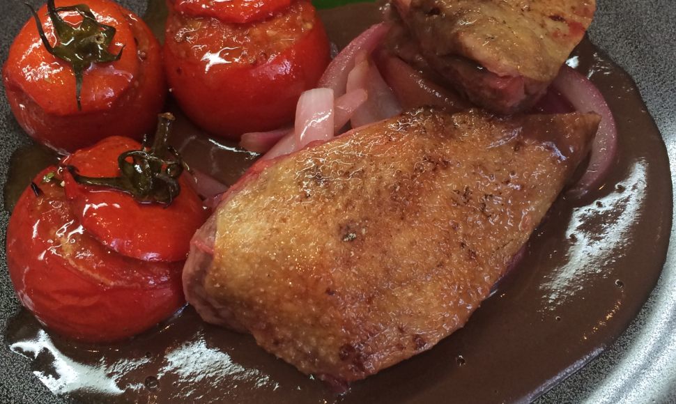 Pigeon de Racan et foie gras de canard, tomate à la tomate, pistou d'herbes tendres