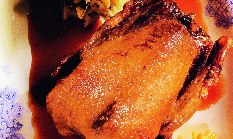 Pigeonneau cuit à la broche,cardons au jus, pommes paille