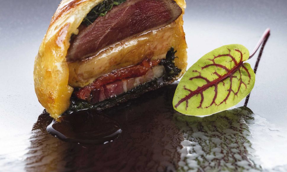 Un pigeonneau fermier en tourte parfaitement assaisonné : jus de pigeon, foie gras, ventrèche, tomate séchée.