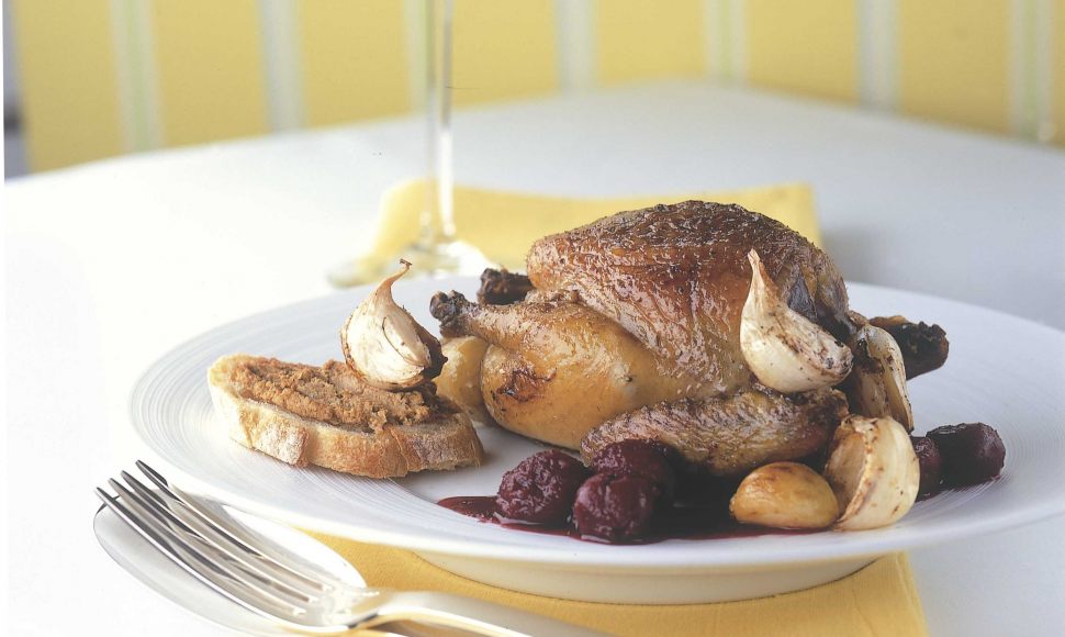Des pigeonneaux à l'ail servis avec une marmelade de cerises, vinaigre de cidre et lardons.