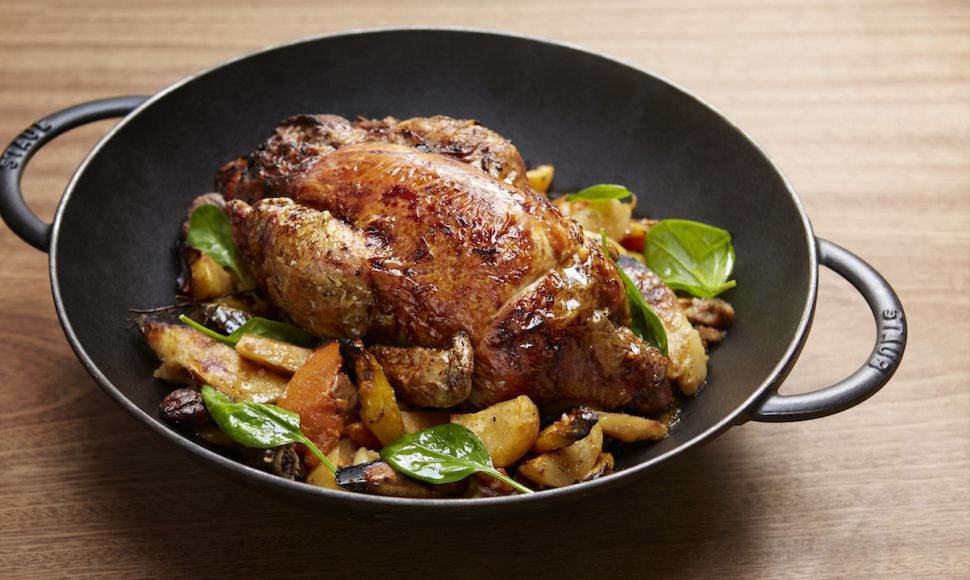 Pintade farcie et panier de légumes d'hiver braisés