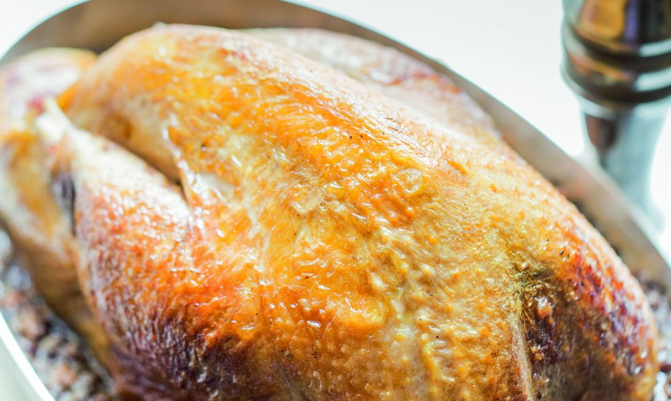 Le jour même, préchauffez le four à 220 °C (th. 7-8) en chaleur sèche. Faites rôtir la pintade avec l’ail, le thym, le beurre et l’huile pendant 40 min en la tournant régulièrement et en prenant soin de l’arroser régulièrement afin que la peau devienne croustillante. Retirez la pintade et déglacez le jus de cuisson avec le fond blanc. Faites réduire sur feu moyen pendant 10 min et mettez de côté pour ajouter aux lentilles.
