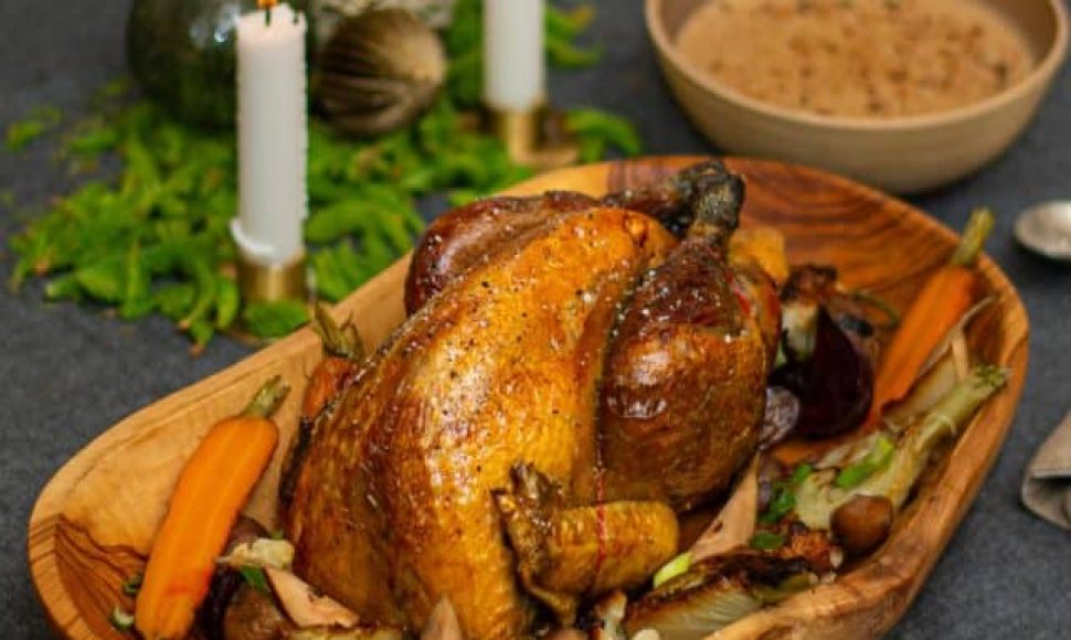 Il n'y a pas plus facile que cette recette festive de la cheffe Chloé Charles : une pintade, des légumes de saison à l'envi et beaucoup de gourmandise. C'est aussi une recette anti-gaspi, qui permet de cuisiner tous les légumes et le pain rassis.