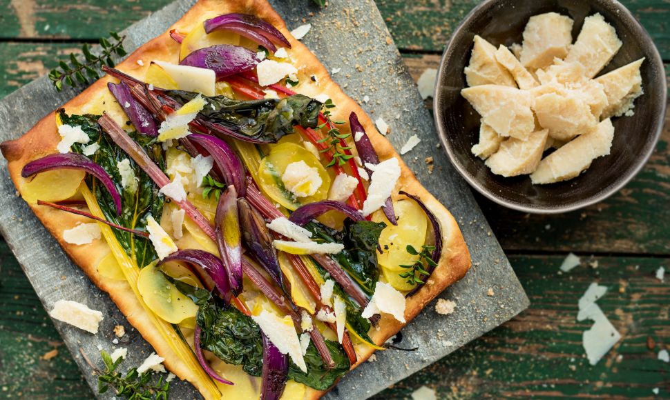 Pizza de pommes de terre, oignons rouges, blettes et Parmigiano Reggiano