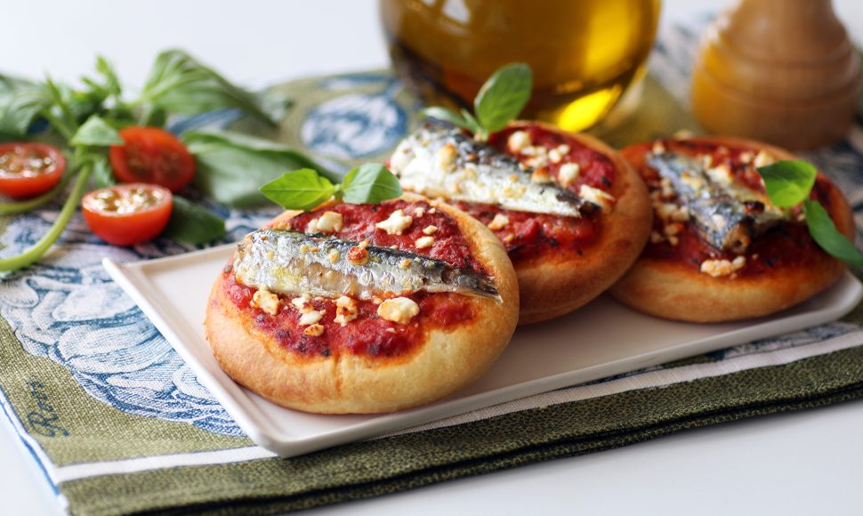 Déposer les sardines sur les pizzettes et parsemer de feta émiettée. Enfourner pour 12 minutes.