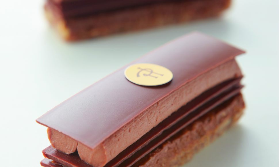 Toute la conception de ce gâteau au chocolat au lait, praliné feuilleté et noisettes du Piémont, repose sur une mise en valeur du chocolat au lait et sur une variation des textures croustillantes, craquantes, moelleuses et fondantes et donc des sensations.