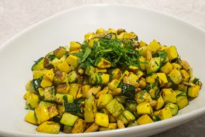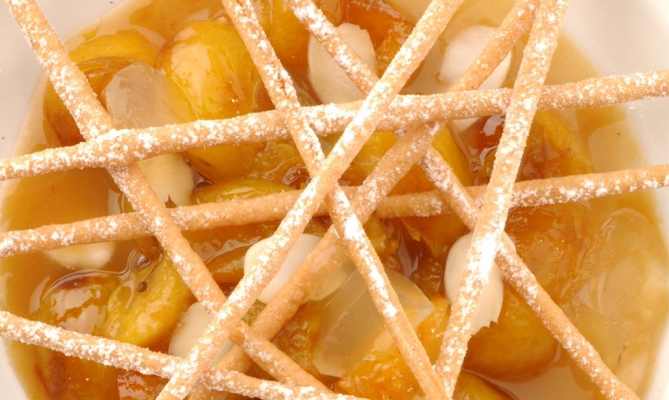 Poêlée de mirabelles au vin blanc, gelée de pomme, mikados à la vanille