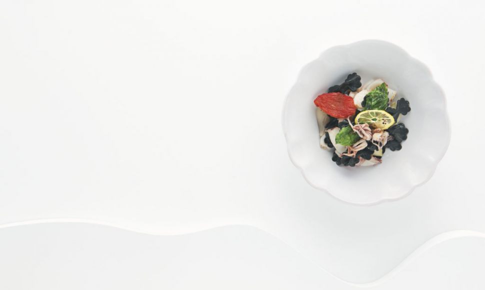 Poêlée de pistes de méditerranée, farfalle à l’encre, tomates