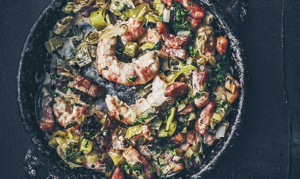 Un plat croustillant et goûteux, des poireaux aux lardons avec des langoustines, un plat aux saveurs terre-mer qui a tout bon.