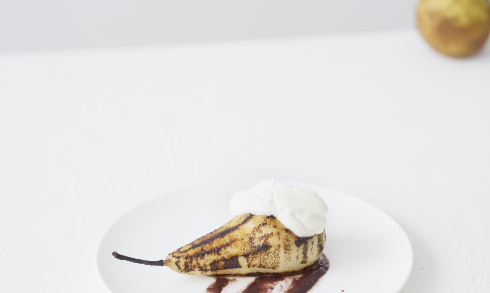 Lorsque les poires sont cuites, vous pouvez les brûler à l’aide du chalumeau pour obtenir une caramélisation plus forte si vous le souhaitez.