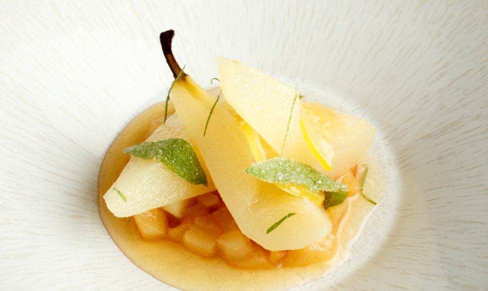 Poire pochée au miel de lavande, sorbet fromage blanc
