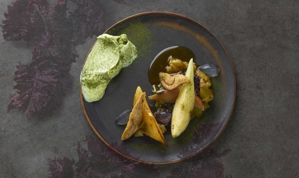 Pilez au mortier le shiso et la poudre d’amandes. Ajoutez le jus de citron jaune, l’huile d’olive, le sel et le poivre.