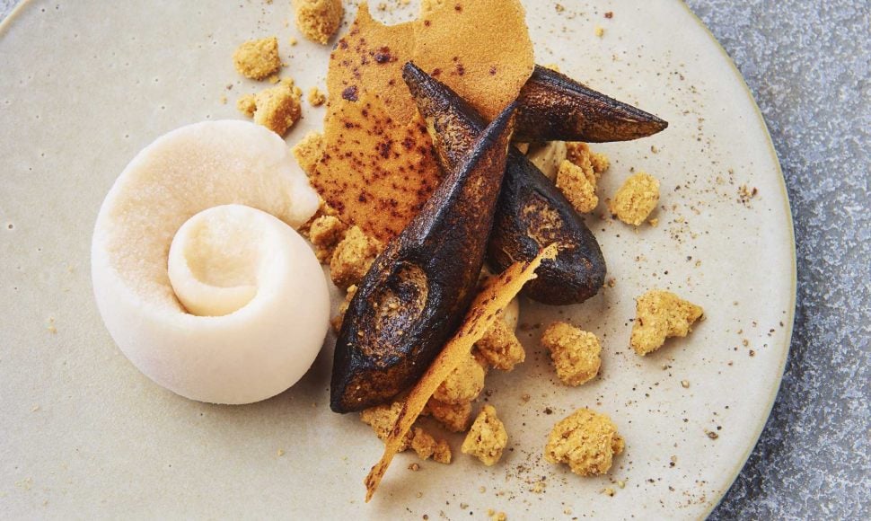Épluchez les poires et coupez-les en quatre. Retirez le cœur, puis laissez à température ambiante pendant 1 h. Brûlez les poires à l’aide d’un chalumeau jusqu’à ce qu’elles soient noires. Conservez-les à température ambiante.