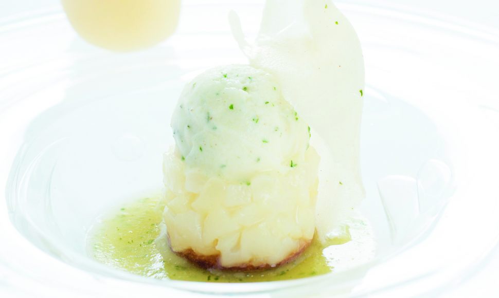 LA VEILLE - Ciselez les herbes. Dans une casserole, mélangez l’eau avec le sucre semoule et le sirop de glucose, portez à ébullition. Ajoutez les herbes et laissez infuser 10 min environ. Versez le sirop menthe-sauge sur la purée de poire. Mélangez et réservez 300 g de cette préparation pour le papier poire-herbes et la gelée poire-sauge. Mettez le reste en sorbetière pour 10 min.