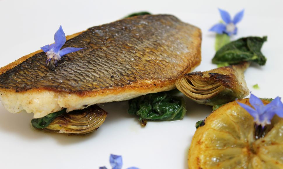 Poisson de la pêche du jour, artichaut, bourrache et citron