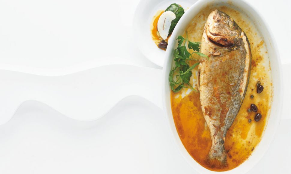 Poisson de la pêche locale au four, aux olives de Nice, sucrines braisées