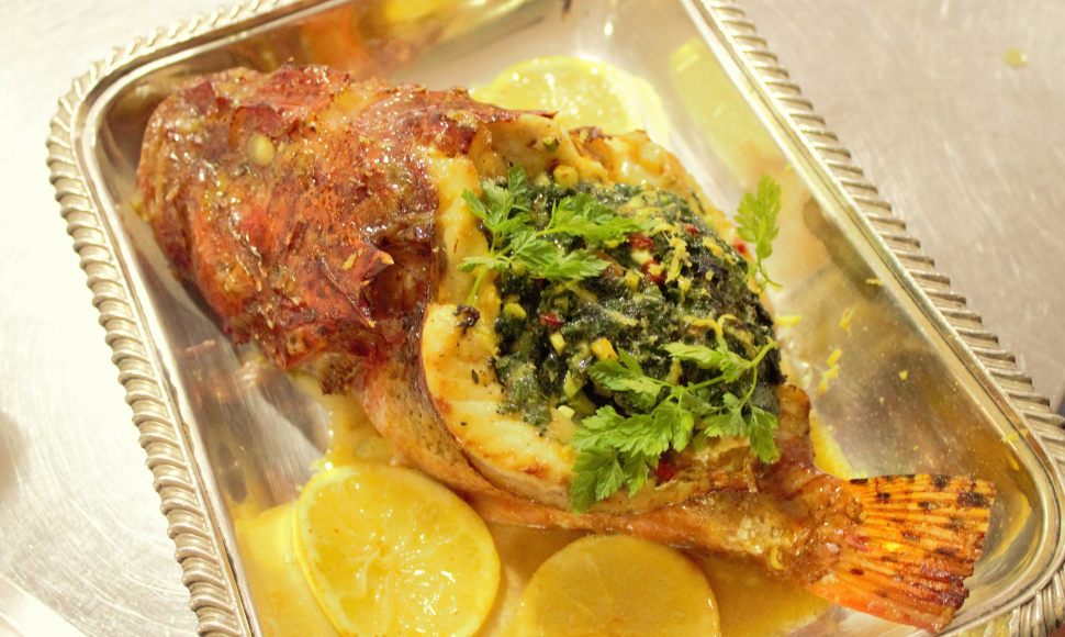 Poisson de Méditerranée farci à la catalane et cuit entier dans un bouillon de Bouillabaisse