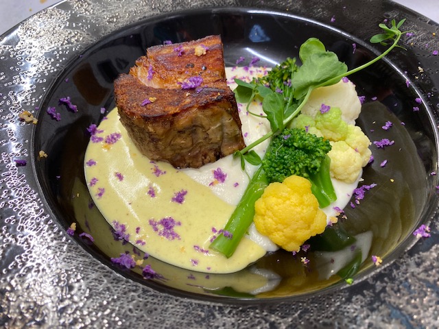 Couper la poitrine en tranche de 2 cm puis les poêler dans un filet d’huile de tous les côtés. Réchauffer les choux dans une noix de beurre et la purée dans une casserole. Dresser à votre goût.