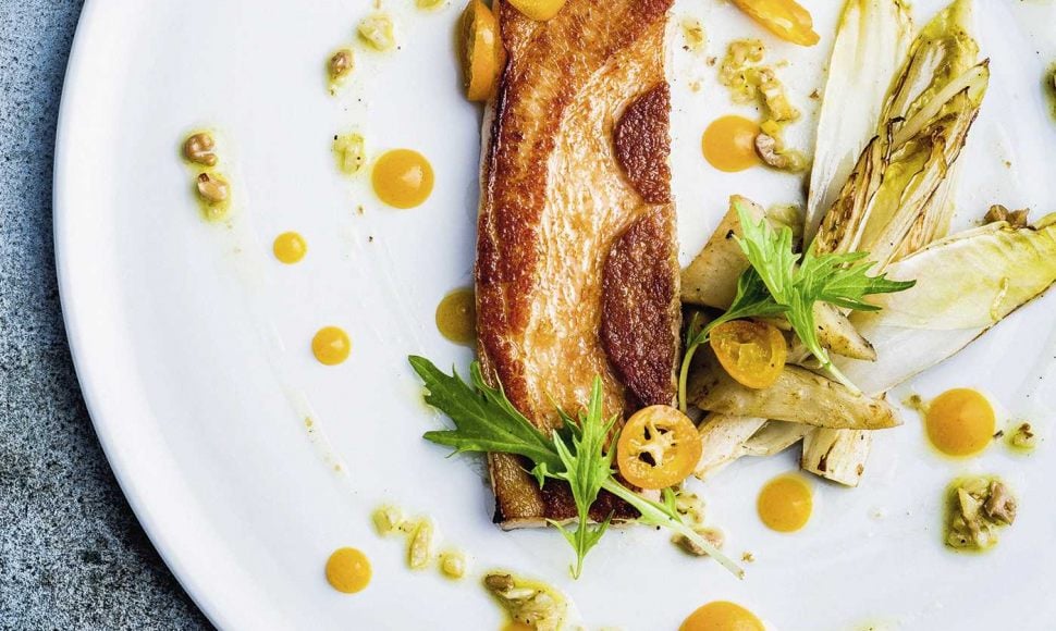 Poitrine de cochon mijotée, vinaigre, kumquats et endives