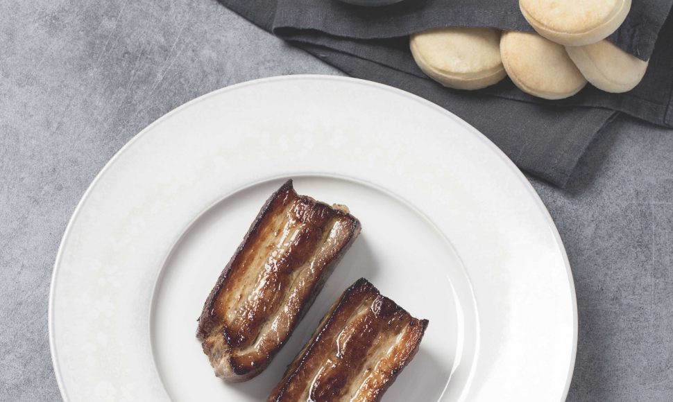 Poitrine de cochon, pain de mie condiment yaourt-concombre