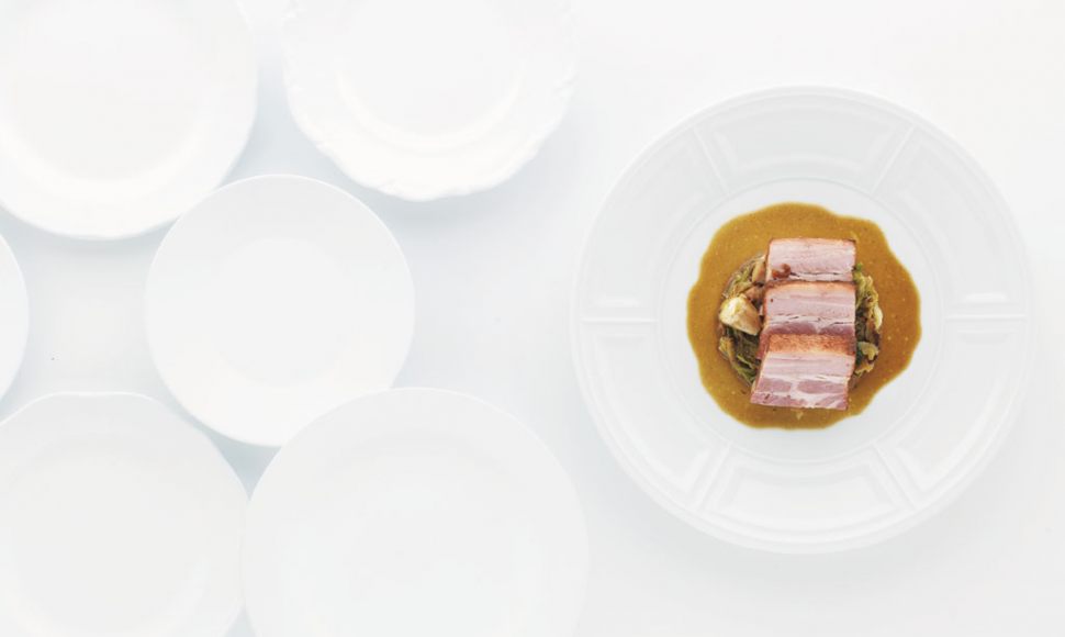 Poitrine de cochon rôtie, chou braisé dans son jus