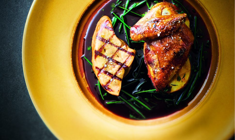 Poitrine de pigeonneau grillée, pommes de terre au thym, sauce salmis