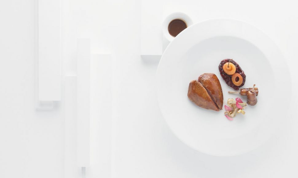 Poitrine de pigeonneau rôti sur le coffre, les cuisses confites, déclinaison de cerises et artichauts