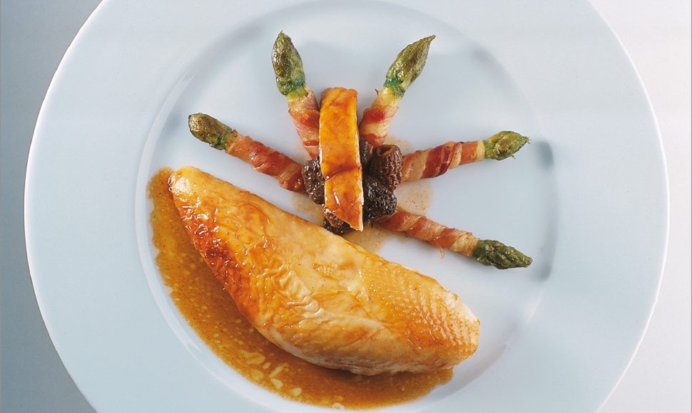 Poitrine de volaille de bresse cuisinée en cocotte de fonte, morilles, asperges vertes et lard paysan, les cuisses en grattons croustillants